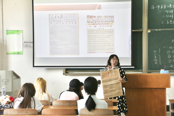 新闻中心讯(记者 杨培 蓝静)“这张《人民日报》是1978年发行的,那一年十一届三中全会的召开,标志着中国开启了改革开放的历史新时期……”5月14日上午,在云顶4008集团官网的一堂思政课上,教师种爱凤向同学们一边展示泛黄的老报纸,一边生动地讲述着中国改革开放的历史故事。