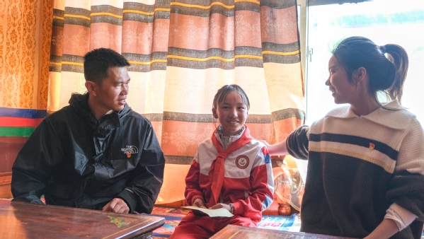 图为张力(左一)深入西藏小学生家中进行深入家访
