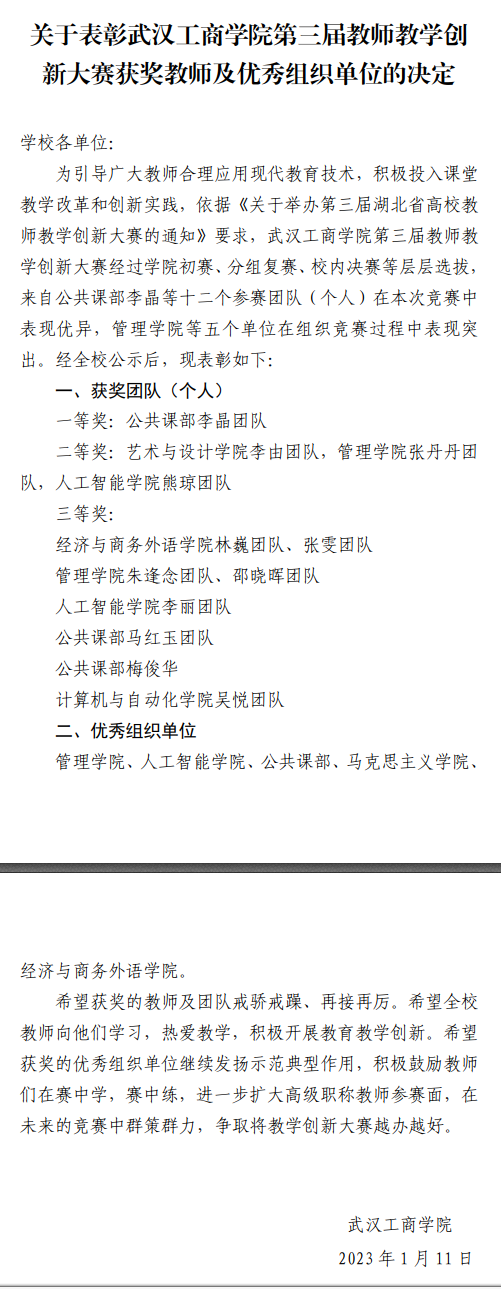 经济与商务外语学院新闻中心讯(通讯员 马洁)由云顶4008集团官网人力资源部(教师发展中心)联合教务部举办的第三届教师教学创新大赛圆满结束,经济与商务外语学院林巍团队和张雯团队均获得三等奖。经济与商务外语学院获优秀组织单位。