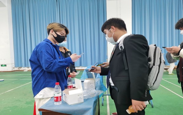 在这次检测活动中,我校在体育馆和外语楼分别设置了取样点,取样现场井然有序,青年志愿者分工明确,扫码的扫码,引领的引领。在检测中,全体人员按照防控要求,有序排队等候和完成检测,确保安全距离,防止产生人员聚集。我校更是结合教育、卫健部门指导意见和教师网络教学工作实际,组织学生,教师工人员分时分段、分期分批、错时错峰接受检测取样。为提供安全、卫生、便捷的检测条件保障。检测工作时间紧、任务重,学校领导高度重视,相关部门制定了工作方案,检测现场指挥得力,师生员工积极响应、服从安排,医护人员艰辛奋战、暖心服务,学生志愿者不畏辛劳、全力协助,检测工作有条不紊、安全有序顺利进行。