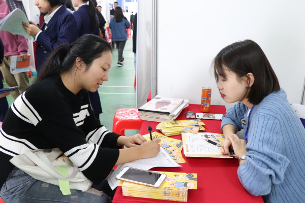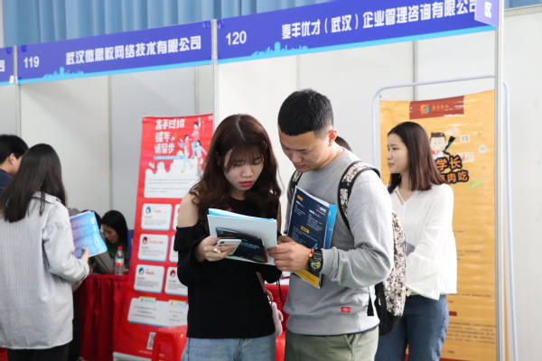 麦丰优才企业管理咨询有限公司的招聘人员曾秋是电子商务学院2019届毕业校友,她介绍到,其公司总经理也是学校2010届毕业校友,该公司目前主要招收入力资源和管理方面的人才,需要有良好的沟通能力和学习能力。武汉流利说信息技术有限公司的招聘展台也吸引了很多同学驻足,该公司招聘人员表示,除了对英语的硬要求以外,该公司更多考虑的是学生个人的工作态度、学习能力、协调能力等各种因素。