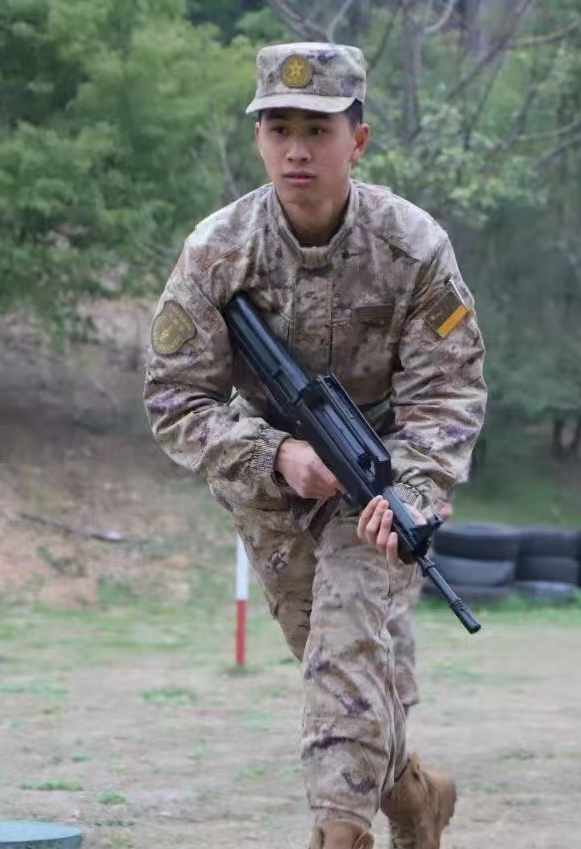 2021年3月,他成为了火箭军某部新兵连的战士。新兵连的训练十分辛苦,跑步训练一跑就是5、6千米,跑完后双腿像灌了铅一样沉重;匍匐前进时手肘、膝盖在沙地上反复摩擦,摩擦部位经常又肿又痛还渗出血水;练习扔手榴弹时一遍又一遍模拟投掷动作,手掌磨出了血泡、胳膊酸胀不到抬不起来......